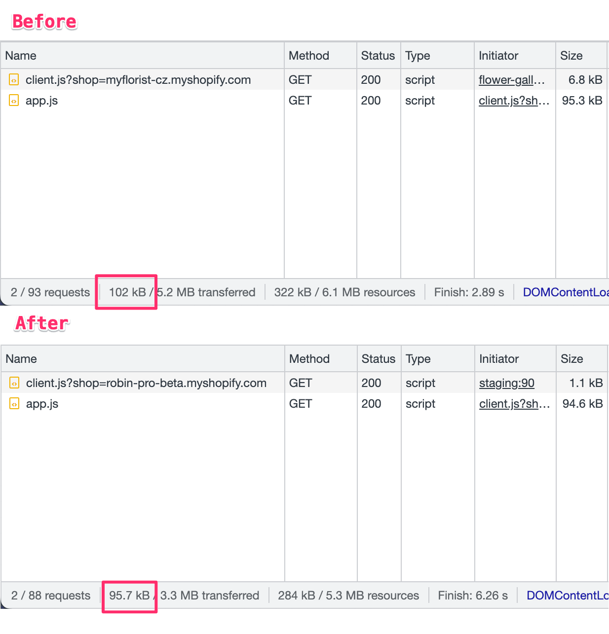 On the storefront, it uses 7% less JavaScript. The client.js file that gets loaded on every page got reduced to just 1.1kB. The code loaded by the app in the admin interface got trimmed down by 55kB (12%).